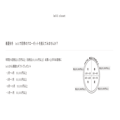 具体的な事例を挙げますと、会員制度の一つ「lelill closet」では「お客様のクローゼットを作っていきたい」が根幹にあります。そのためには1年の季節ごと、年間4回ご来店頂く必要があります。そこで、季節ごとに商品を一定価格ご購入された方へプレゼントをご用意しました。