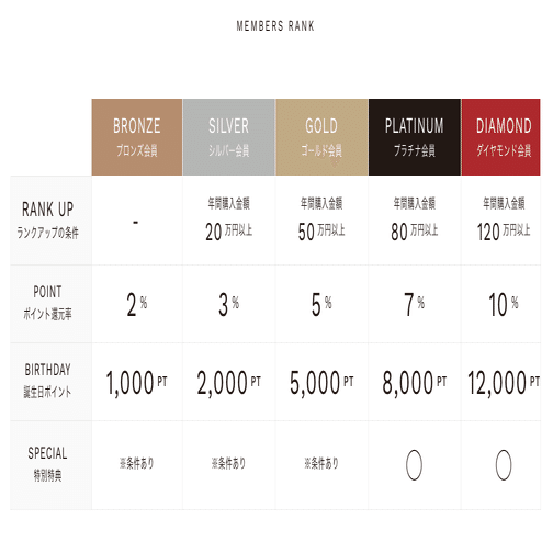 ステージによってポイント付与率や誕生日ポイントは変わりますが、原則的な方針として「取り寄せ」「取り置き」はしません。また、出来る限りフラットに対応していますので特別な贔屓はしていません。そして年間の最終ギフトにて、お買い上げ金額に応じてプレゼント内容が変わります。